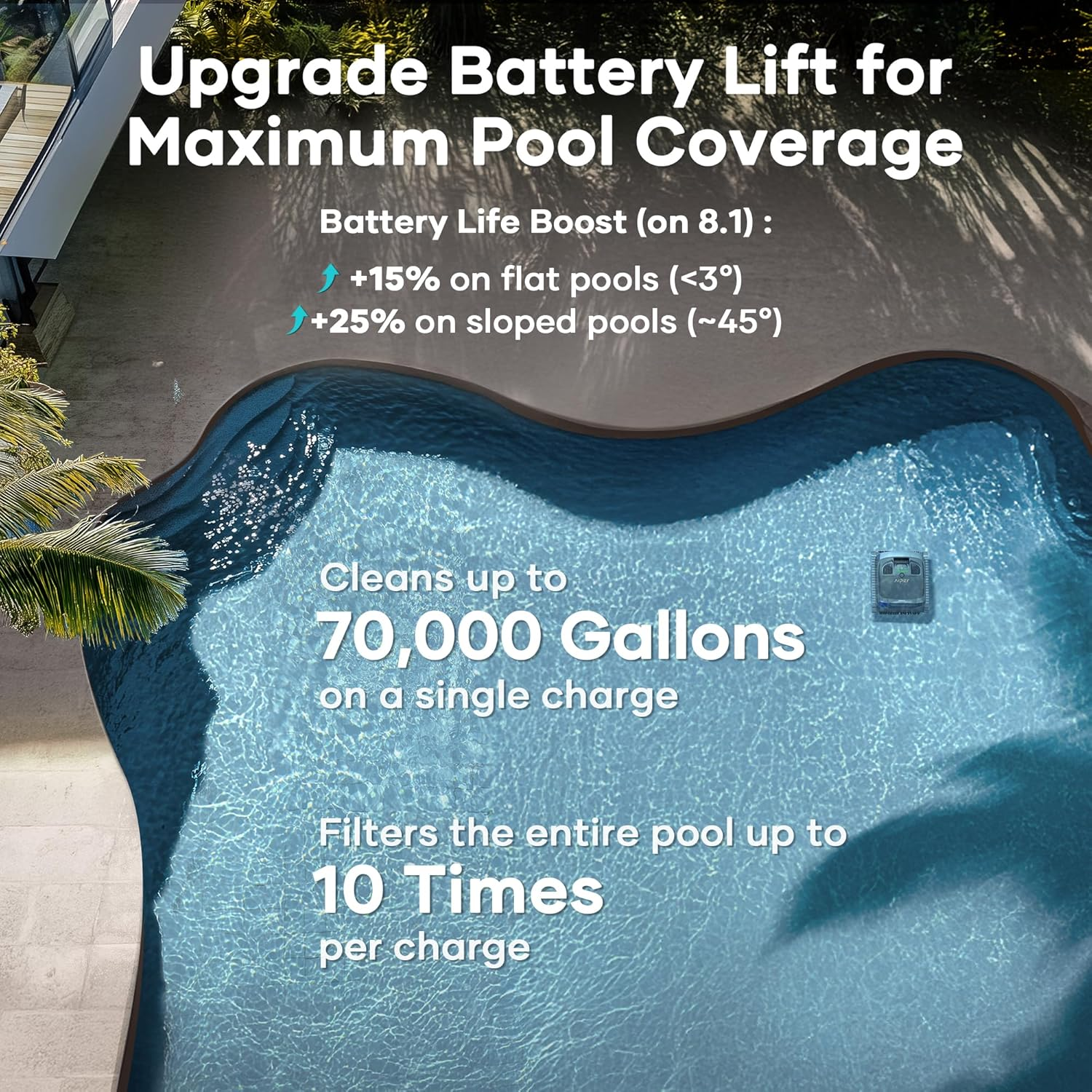 The Aiper® Scuba X1 Robotic Vacuum Cleaner battery-powered inground pool cleaner effortlessly cleans up to 70,000 gallons, and 2,150 sq.ft on a single charge, completely recharging in four hours. With four standard onboard cleaning modes and an additional cleaning method available through the downloadable app, the Scuba X1 can clean nearly every surface of your pool and fits seamlessly into your cleaning routine. With a 6,600 GPH suction power, this quad-motor cleaner effortlessly removes debris from your pool.