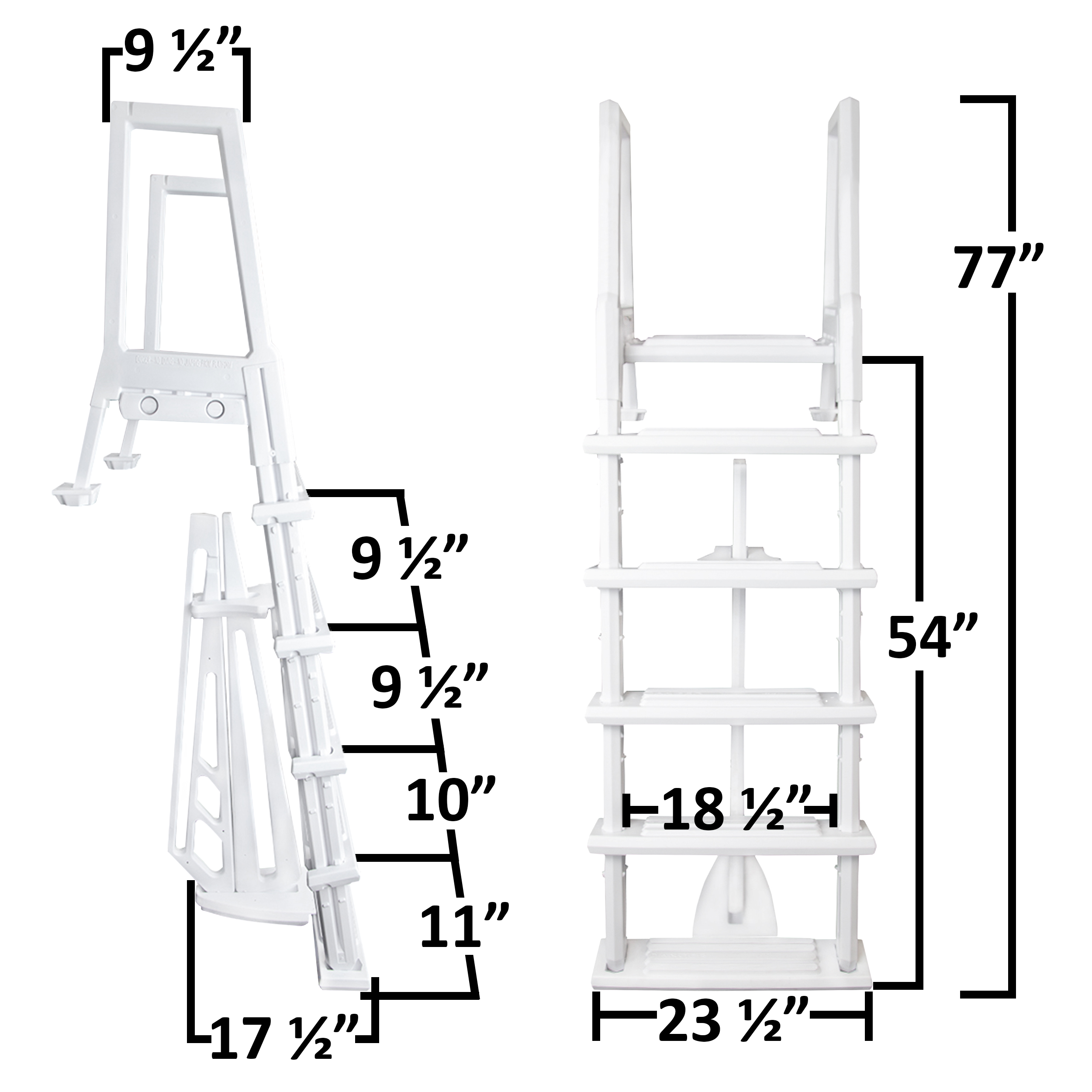 The Aqua Select® heavy-duty resin ladder will make getting in and out of your above ground and semi-inground pool a breeze. Designed for flat bottom pools this easy-to-assemble ladder features an entrapment barrier that attaches to your submerged steps to provide extra safety and prevent anyone from swimming behind them. Each step includes 5" deep treads to prevent slipping and can accommodate a weight limit of 350 lbs. This Aqua Select® ladder can be used with pools and decks with a wall height of 48", 52", and 54".