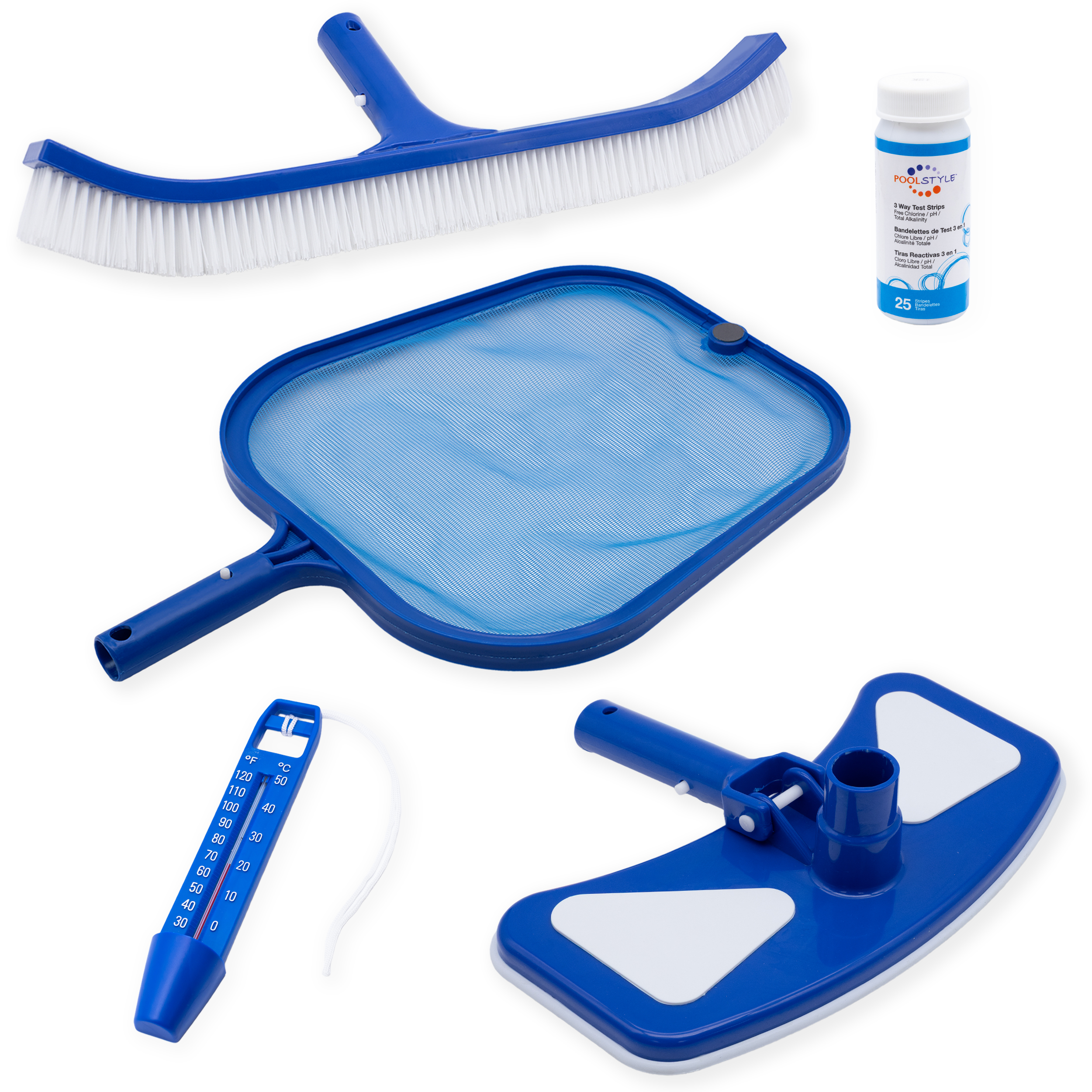 Complete with everything you need to clean vinyl lined inground or above ground pools, the Aqua Select® Basic Maintenance Kit is ideal for first time pool owners. This maintenance kit includes all the most common pool tools to keep your vinyl walls and floor clean. The weighted vac head and wall brush make cleaning your pool’s floors and walls a breeze, while the included standard leaf skimmer helps you remove leaves, dirt, and debris from the surface. The leaf skimmer includes an integrated magnet for picking up hairpins and other small metal objects. Test your water with ease using the test strips and the convenient water pocket featured on the thermometer.