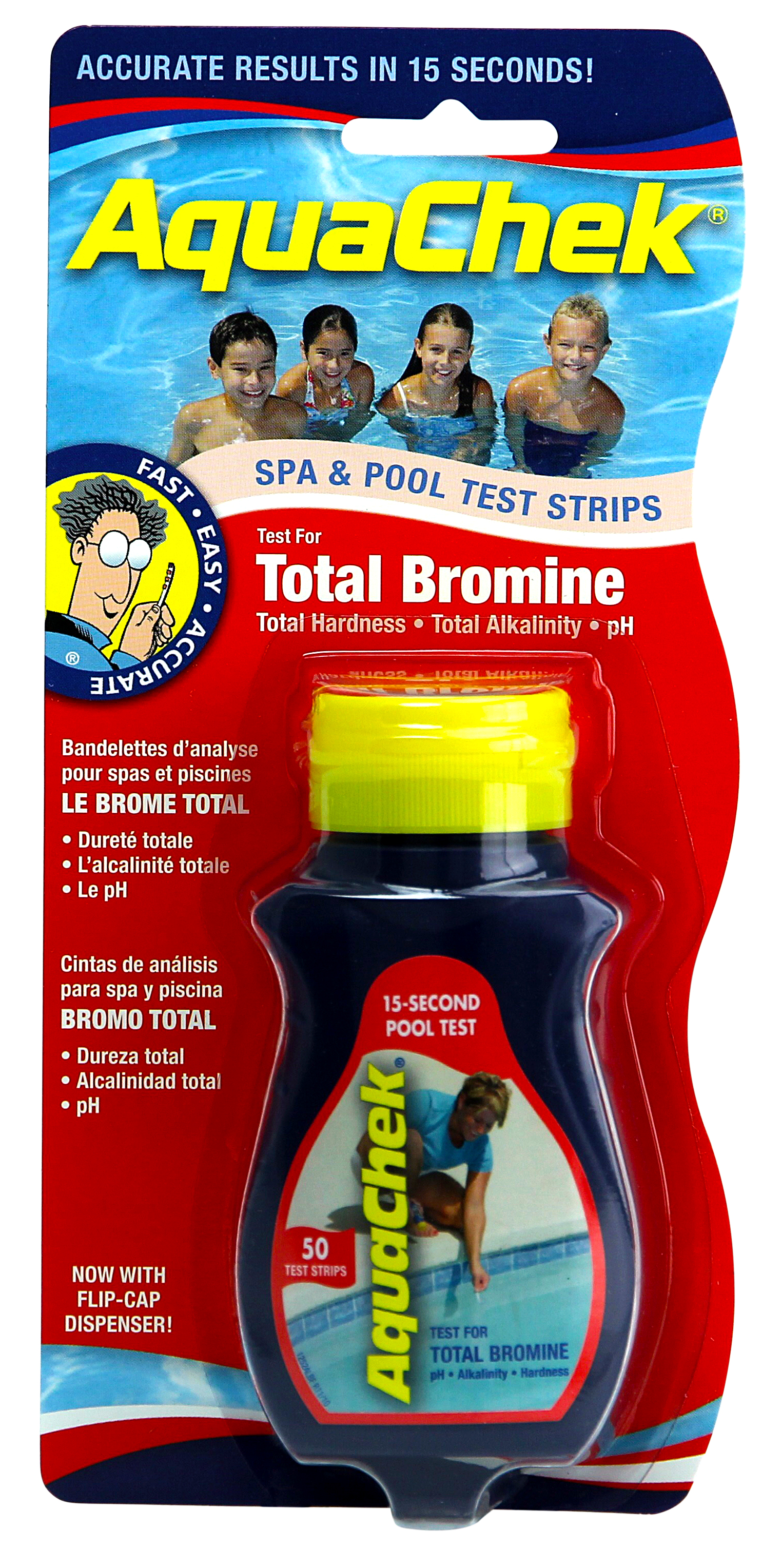 AquaChek® Red Total Bromine Test Strips measure total bromine, pH, total alkalinity, and total hardness in your spa or pool water. Simply dip a strip into the water for one second and remove it immediately for fast results. It's incredibly easy! Each package contains 50 test strips along with complete instructions in 15 languages.
