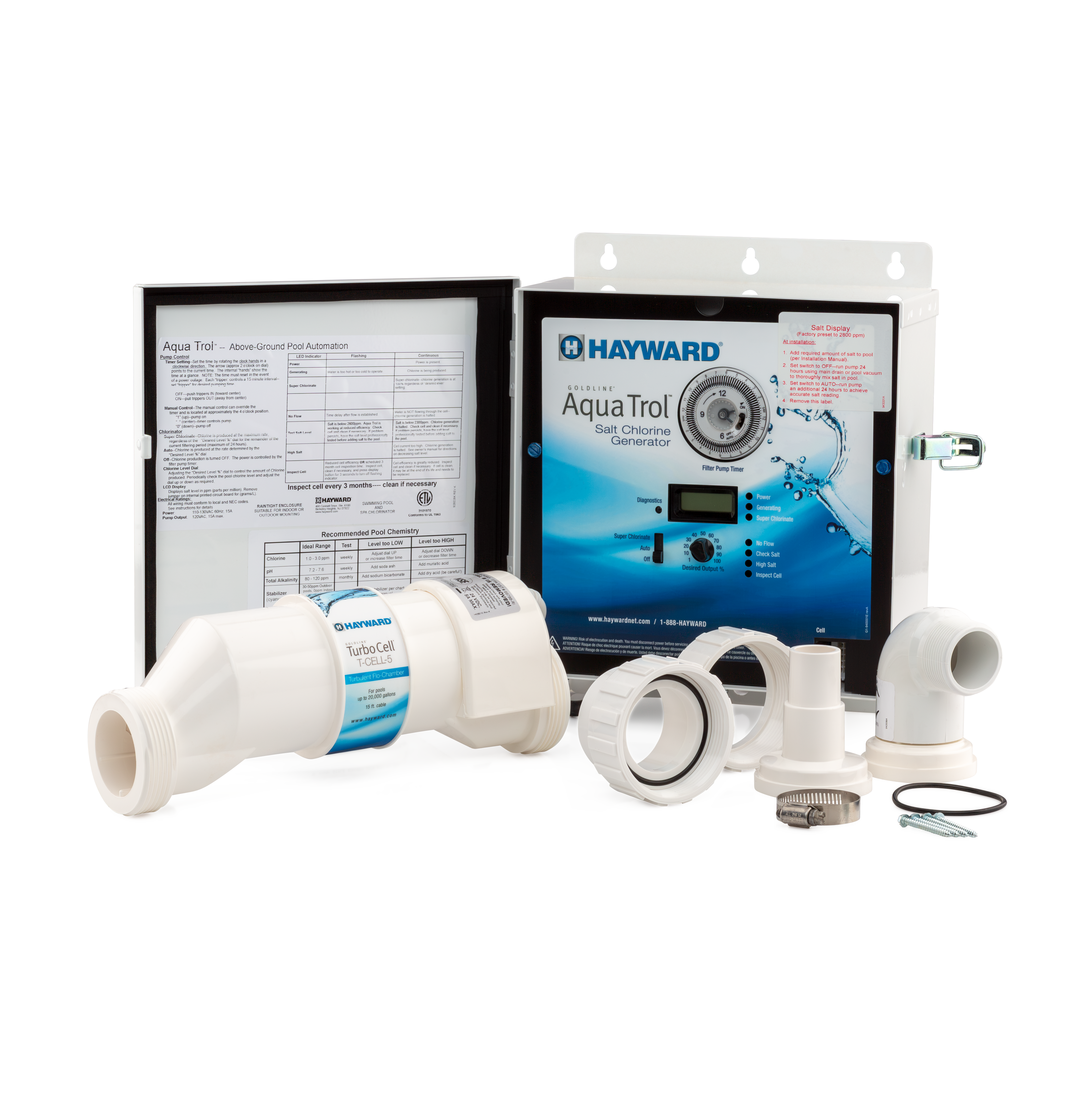 The Hayward® AquaTrol Salt Chlorination System W3AQ-TROL-RJ with GLX-CELL-5 Salt Cell is a reliable and efficient solution for chlorinating your pool. This system is designed to convert salt into chlorine, eliminating the need for traditional chlorine tablets or liquid. It is suitable for pools up to 18,000 gallons in size. The AquaTrol Salt Chlorination System ensures clear and clean pool water with ease. The system is easy to install and operate, providing convenience and simplicity in pool maintenance. With its Turbo Cell technology, it delivers consistent chlorine production for optimal sanitization. Enjoy crystal clear water and a comfortable swimming experience with the Hayward AquaTrol Salt Chlorination System.