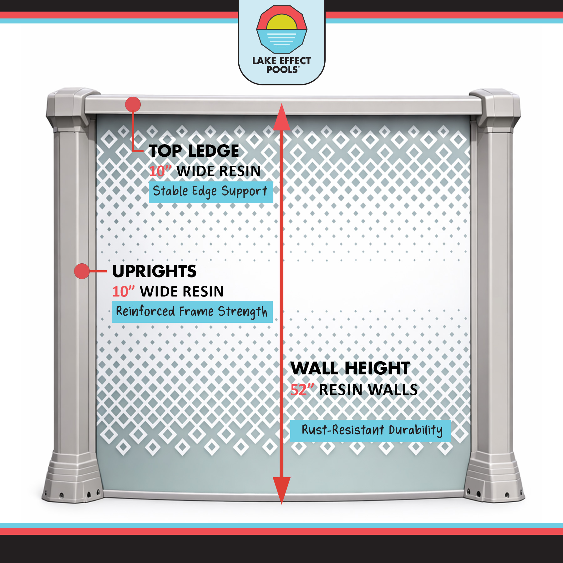 Extra-wide 10” resin top ledges and 10” resin uprights provide structural integrity, giving your above ground pool a rock-solid foundation, while the resin walls bring a multi-layered defense system against rust, salt, and UV rays.