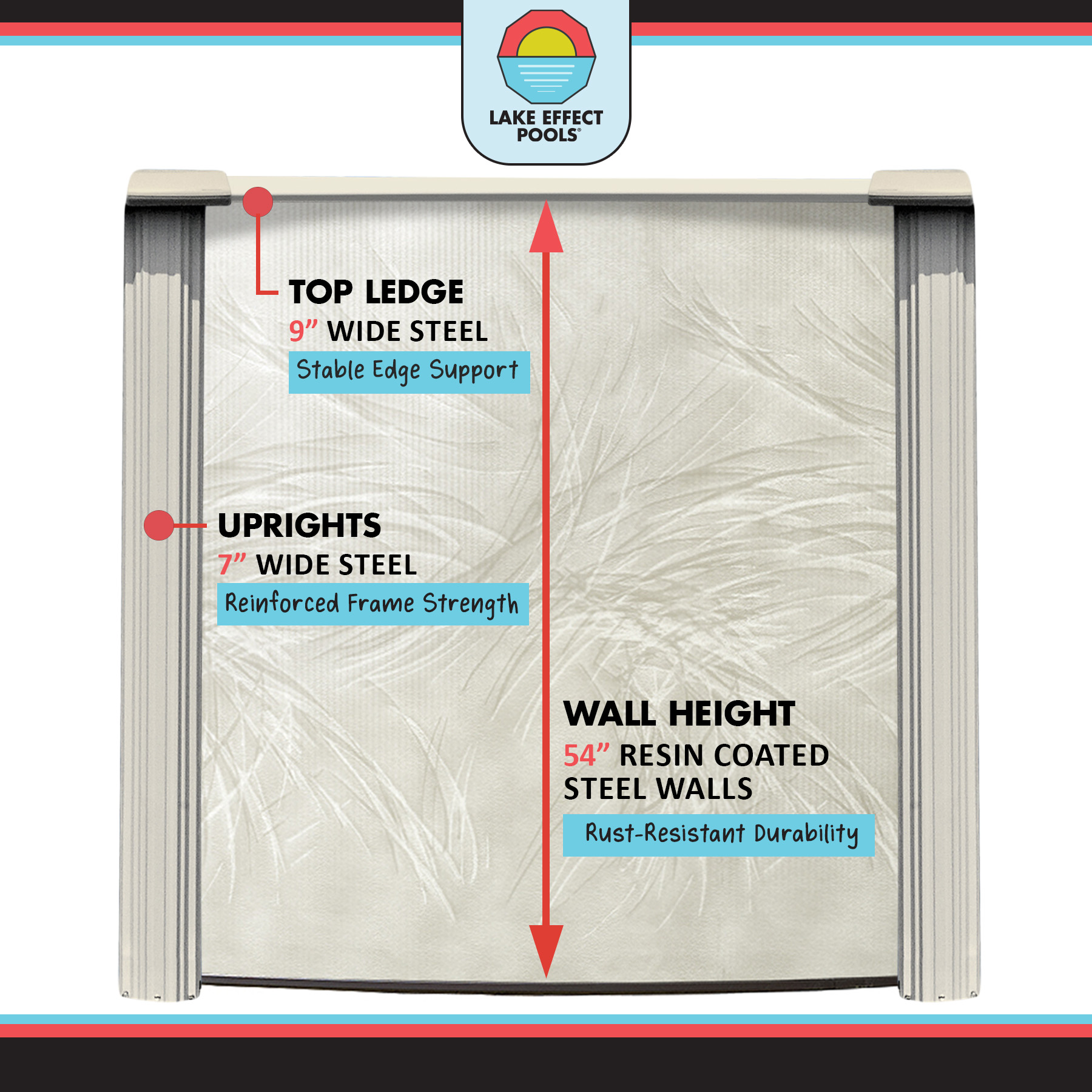 Extra-wide 9” steel top ledges and 7” steel uprights provide structural integrity, giving your above ground pool a rock-solid foundation, while the resin-protected steel walls bring a multi-layered defense system against rust, salt, and UV rays.