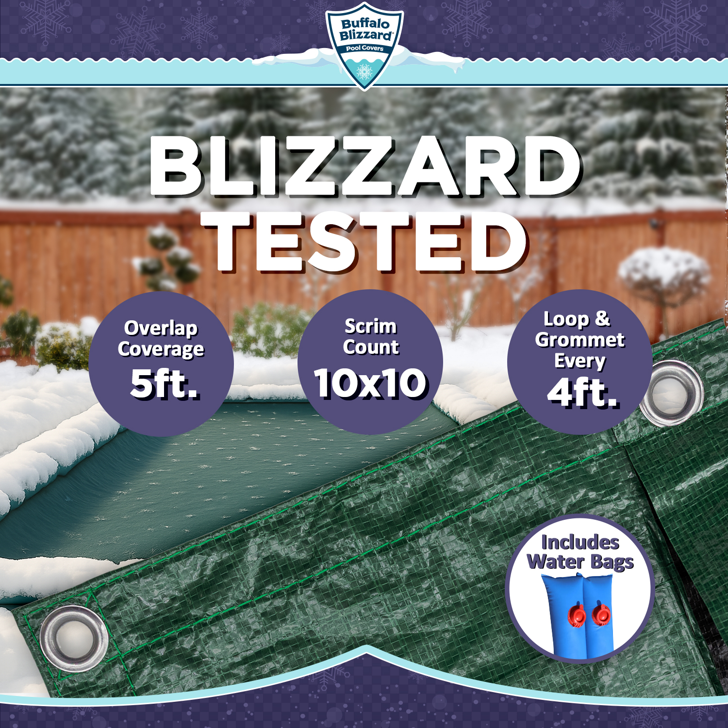 Made from a tough and durable polyethylene fabric, the Buffalo Blizzard® Supreme cover is specially designed to protect your pool from snow, ice, and debris during the off-season. Each cover is constructed from a triple-laminated material that is resistant to cracking, splitting, and tearing from cold temperatures. With 10 x 10 Hold-Tite scrim per square inch, this cover was designed with durability in mind and features UV-resistant threads for added strength.