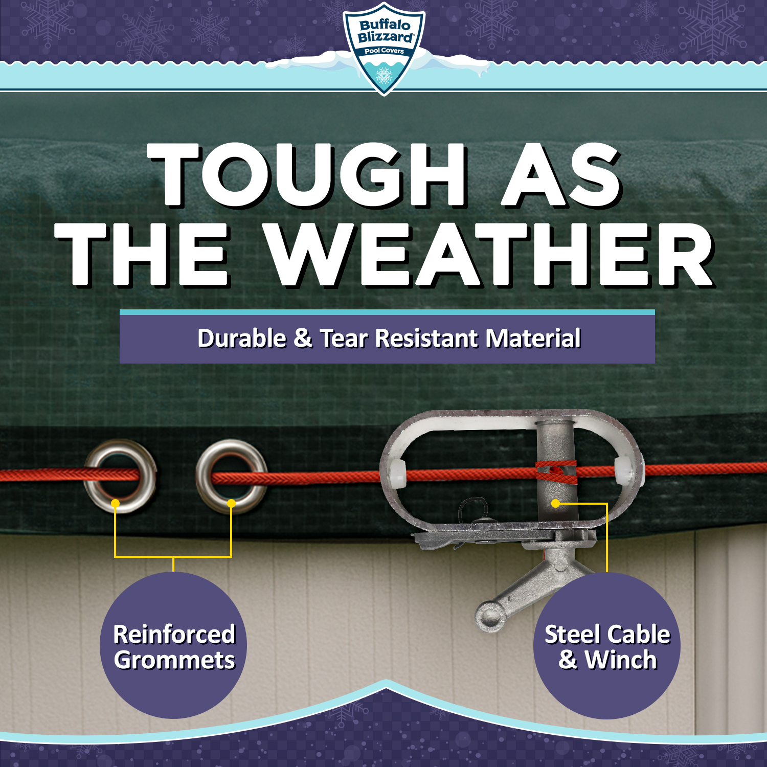 Made from a tough and durable polyethylene fabric, the Buffalo Blizzard® Supreme Plus cover is specially designed to protect your pool from snow, ice, and debris during the off-season. Each cover is constructed from a triple-laminated material that is resistant to cracking, splitting, and tearing from cold temperatures. With 12 x 12 Hold-Tite scrim per square inch, this cover was designed with durability in mind and features UV-resistant threads for added strength.