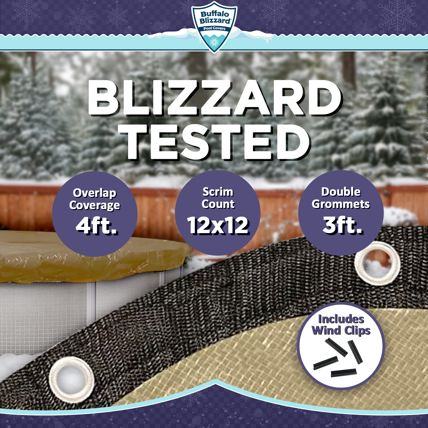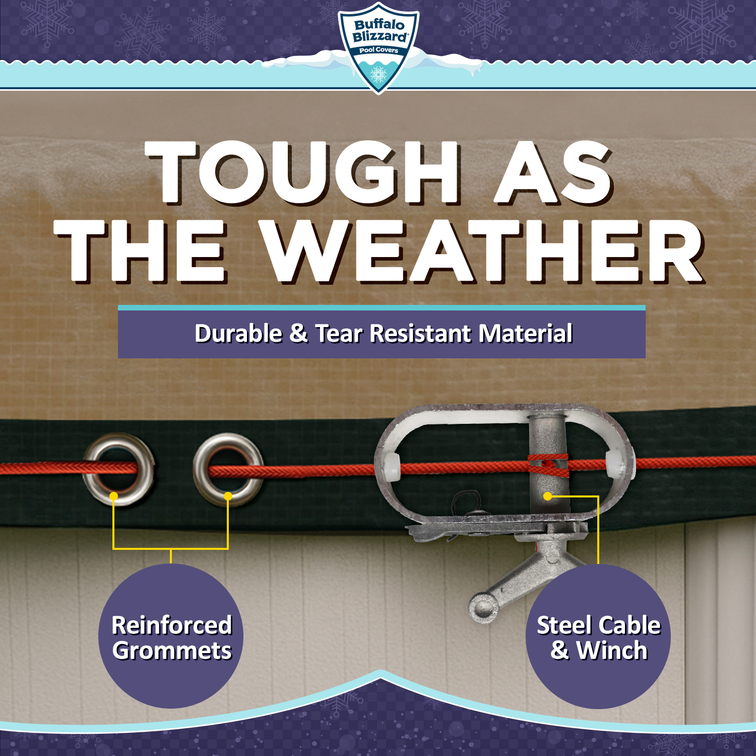 Made from a tough and durable polyethylene fabric, the Buffalo Blizzard® Supreme Plus cover is specially designed to protect your pool from snow, ice, and debris during the off-season. Each cover is constructed from a triple-laminated material that is resistant to cracking, splitting, and tearing from cold temperatures. With 12 x 12 Hold-Tite scrim per square inch, this cover was designed with durability in mind and features UV-resistant threads for added strength.